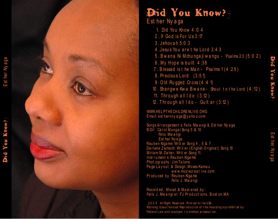 Esther Nyaga has dedicated the CD to support the cause of children who suffer one form of deprivation or other. With the debut in 2005, she donated ( via UNICEF) a portion of the CD sales to the children in Niger who were suffering from the deadly effects of famine in that country. Esther continues to donate a portion of the sales of this CD to various orphanages in Africa.